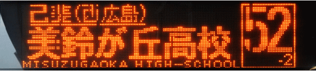 なんと、広電バスは方向幕にも優勝をたたえる表示が出ています。 LEDならではの工夫ですね。 (アニメーションにしてあります。実際はもう少しゆっくり変化しています) |