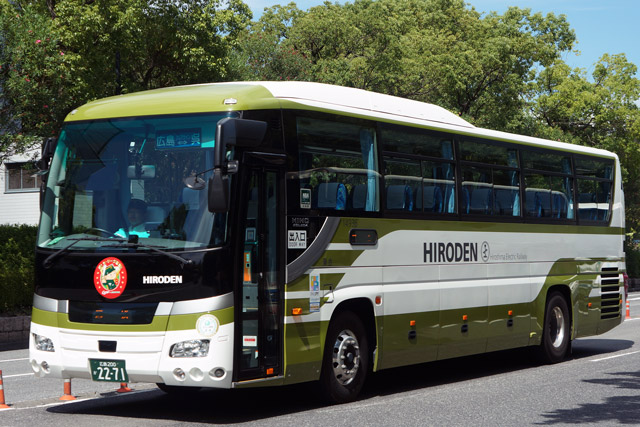 今年も広電バスは一部路線の方向幕に優勝をたたえ る表示が出ています。LEDならではの工夫ですね。 |