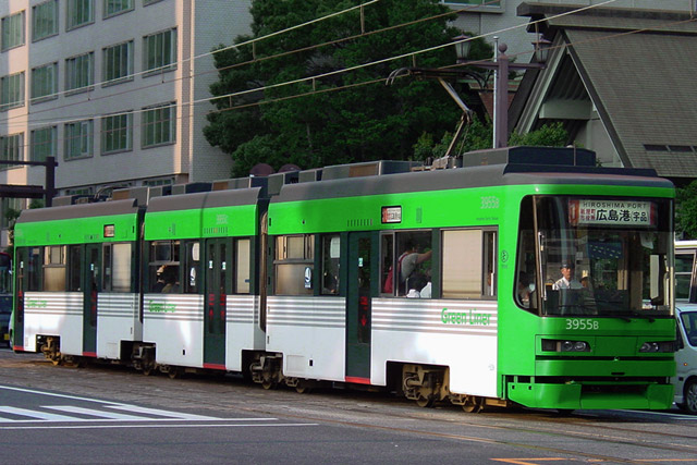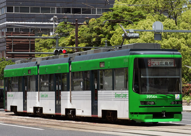 | 広電3900形のマイナーチェンジ形で性能的には変わりませんが、外観が随分変わりました。ヘッドライトが4灯式となりロービームライトは日本の鉄道用車両で初めてプロジェクター式ヘッドライトが採用され、パンタグラフはシングルアームに変わりました。また屋根上の機器が見えにくいように工夫されています。直線的なデザインから曲面を多用したデザインになり、ドアガラスも大きくなり視界が広がりました。カラーリングも一新されました。 導入時は宮島線を走り、一時期市内線に転用され、再び宮島線に返り咲くという忙しい車両です。 「ぐりーんらいなー」としては最後の形式です。この形式のみ英字表記になっています。 |