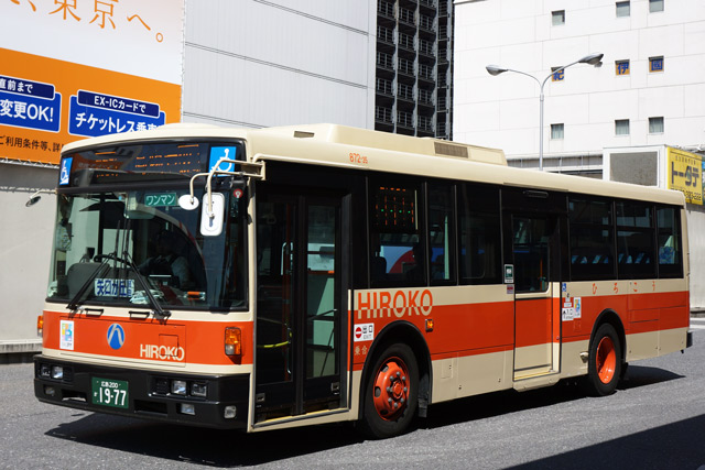 ノンステップ車に比べるとオレンジの帯の幅が広めで「HIROKO」の文字がタイヤハウスの上に書かれているので最初ワンステップ車かと思いました。でもちょっと窮屈そうに見えますね。「ノンステップバス」とも書かれていません。