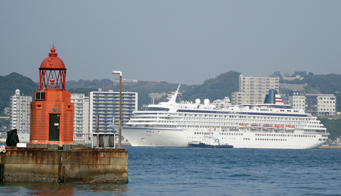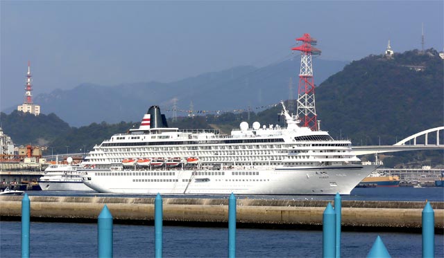 241m、5万トンの船体は広島の1万トンバースから船首がはみ出しワイドレンズを使っても、とうてい近距離から写しうるものではありませんでした。まさに海上の豪華ホテル! 一度でいい、この船で旅をして見たい。見学に来られた人たちは口々にそう言ってこの夢の客船を見上げておられました。