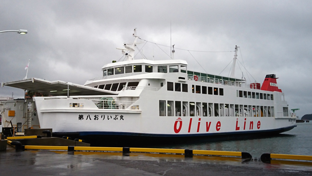 | 激レア画像です。3月12日から国際フェリー「第三十二こくさい丸」のエンジントラブルの為、「第八おりいぶ丸」が代船運航していました。「フェリーひなせ」は四国汽船の「あさひ」代船運航の為、国際フェリーに配船出来ない為、今回は特別配船です。小豆島池田港にて撮影です。 |