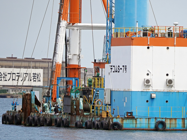 | 深層混合処理船というのは、海底の軟弱地盤の中にセメントミルクを混入することによって地盤改良を行うための作業船のことです。船上のヤグラには、海底を攪拌し処理剤を注入する処理機がセットされているほか、セメント系処理剤の作業船には、サイロや混合プラントも設置された「移動式コンビナート」のような船なのです。