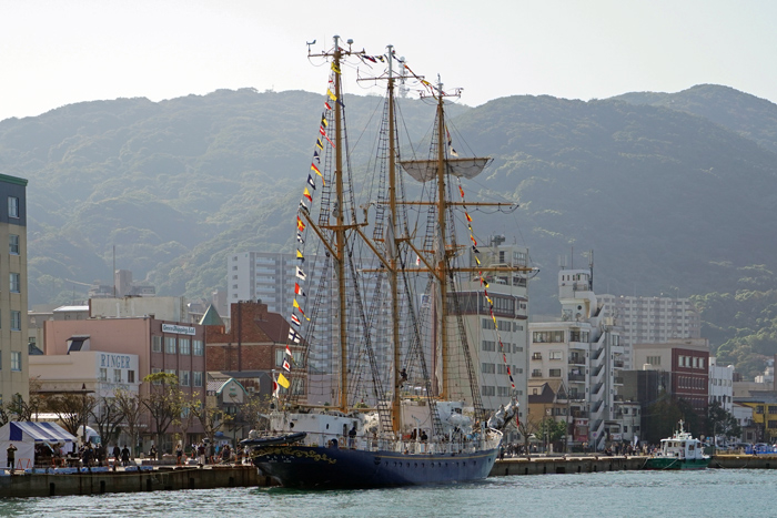 | 元は当HPでも紹介してあります大阪市の「セイル・トレーニング事業」に使用されていた帆船あこがれです。事業が廃止され売船となり、グローバル人材育成推進機構が購入、2014年7月5日から船名が「みらいへ」に変更され体験航海事業で使用されています。 本船が尾道に停泊している様子はみらいへ in Onomichiに掲載してあります。 2019年11月16・17日に、門司港開港130周年記念「130周年だよ!船舶集合!」というイベントで門司港に来航し、一般公開やセーリング体験などが行われました。私はイベントに参加するために2年ぶりに門司港を訪れ、本船の船内を見学し、また帆を張ったところを見ることもできました。帆船は何度か見ましたが、帆を張ったところは見た事が無かったので、その美しさには大感動でした。 ここにはその時の様子を載せてみたいと思います。船員さんたちはとても親切に船の事を説明してくださいました。ありがとうございました。 【帆船豆知識】 本船は3本マストの帆船です。前から「フォアマスト」「メインマスト」「ミズンマスト」と呼びます。またへさきから前に突き出している棒を「バウスプリット」といいます。ここからフォアマストにロープが伸び、三角形の帆が張られます。 バウスプリットの根元から船首付近に航海の安全を願ってフィギュアヘッドが取り付けられている船がありますが、本船は「ヤマトタケルノミコト」です。 |