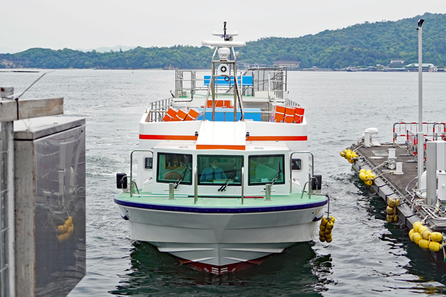 | 2022年5月21日、宮島口〜宮島航路に68年ぶりにアクアネット広島が新規参入しました。就航したのは新造船「りうぐう」です。宮島口と宮島を約7分で結びます。他社のフェリーより2〜3分早く対岸に到着します。 客室には71席(補助席を加えると79席)あり、後部甲板には優先席が3席備えてあります。船上デッキにはベンチが22席あり、瀬戸内の潮風を直接肌で感じながらの航海ができます。 就航から1週間、早速乗ってきました。エンジン音は静かでゆれもほとんど無く快適な乗り心地でした。 |