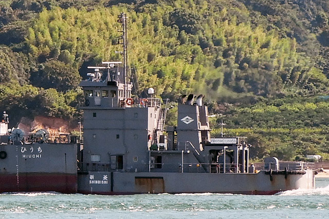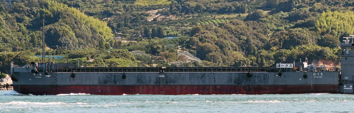 | コークス専用船(台船)「ひうち」と押船「新菱」(しんびし)のプッシャーバージです。船体の色から遠目に見ると自衛隊の船のように見えますね。 「新菱」は2025年版の船舶明細書から削除されていましたので、引退したものと思われます。 |