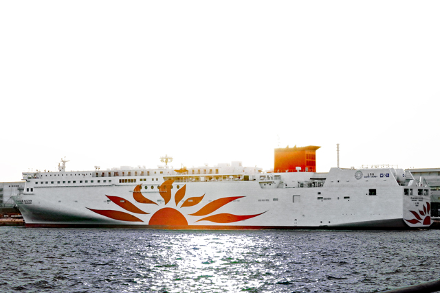 | 本船は1997年に就航したさんふらわあ こばるとの代替船として、三菱重工業下関造船所で建造されました。搭載車両はトラック137台(13m換算)乗用車100台となっています。 総トン数は17,114GTで阪九フェリー「せっつ」を抜いて瀬戸内海最大サイズのフェリーとなりました。 「せっつ」の諸元 ・総トン数:16,292トン ・全長:195m ・型幅:29.6m ・航海速力:23.5ノット ・旅客定員:663名 ・トラック277台・乗用車:188台 国内初のLNG(液化天然ガス)燃料を使用できるフェリー(A重油とLNGの両方を使えるDual Fuelエンジンを搭載)です。船尾甲板に大きなLNGタンクを2基搭載しています。姉妹船に2023年1月13日に就航したさんふらわあ くれないがいます。 |