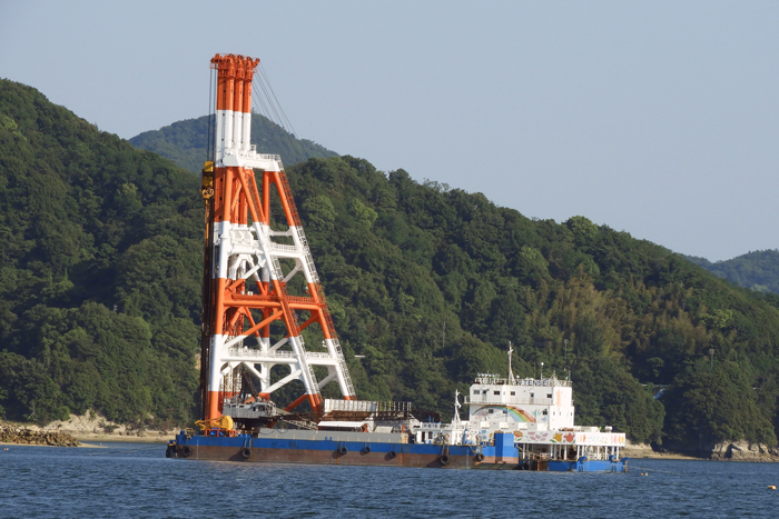 | サンドコンパクション船というのは、軟弱な地盤の中に振動や衝撃荷重などを用いて砂を圧入し、直径の大きい締め固められた砂の柱を造って地盤を安定化させることを目的とした作業船のことをいいます。ガットバージ・揚錨船・交通船などが組となり船団で作業をすることが多いようです。 ●船団 天成 SCP船(長さ:68.00m×幅:27.50m×深さ:4.30m) 非自航式 栄福1号 ガットバージ(長さ:50.00m×幅:20.00m×深さ:4.50m) 非自航式 第3天成 揚錨船1,000PS(長さ:22.01m×幅:7.80m×深さ:2.30m) 第5天成 作業船兼交通船190PS(長さ:9.40m×幅:2.80m×深さ:1.00m) ※揚錨船(ようびょうせん)というのは、浚渫船や起重機船等の作業用錨(いかり・アンカー)の設置・移設・揚収等の作業を行う船舶をいいます。 写真はSCP船天成の手前にガットバージ「栄福1号」が横付けされているところです。また、向こう側には揚錨船「第3天成」がいてお尻が一部見えています。 |